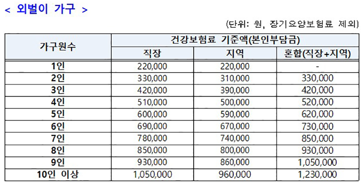· 2024년 귀속 금융소득 합계액이 2,000만 원을 초과하는 가구 - 1인 가구는 청년세대·고령층의 특성을 고려하여 보정 기준 있음. 맞벌이 등 다소득원 가구는 가구원 수 기준을 1명 더한 기준을 적용하는 경우 있음.
