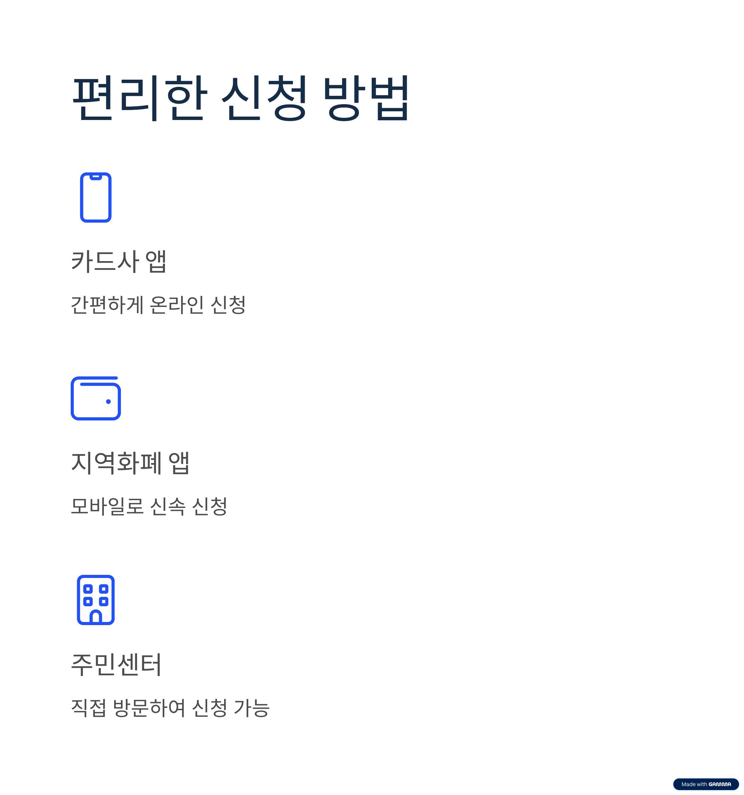 - 읍면동 주민센터 방문 또는 카드사 은행 창구에서 신청 가능