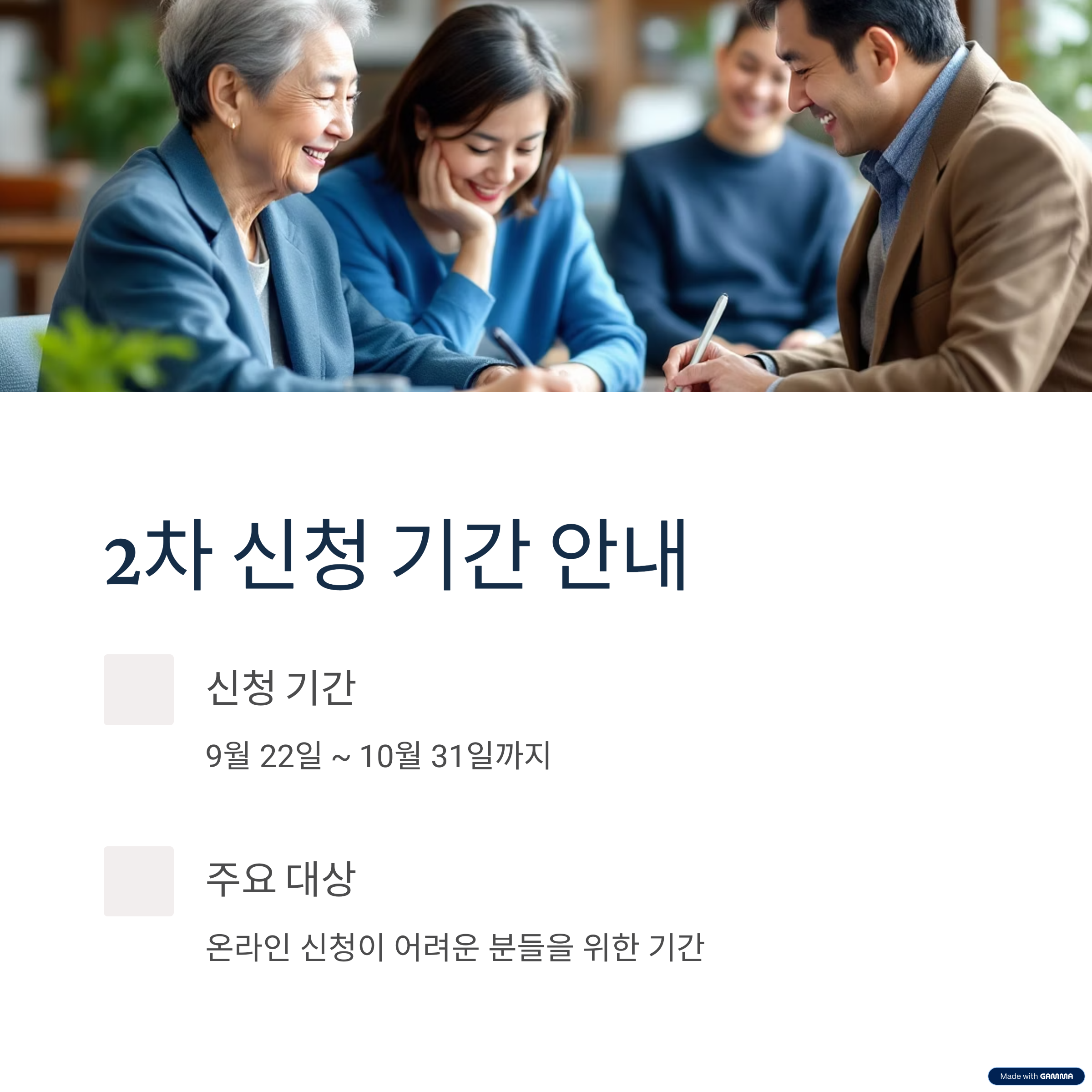 A2. 네, 2차는 9월 22일부터 10월 31일 사이에 신청하며, 금액은 1인당 10만원입니다