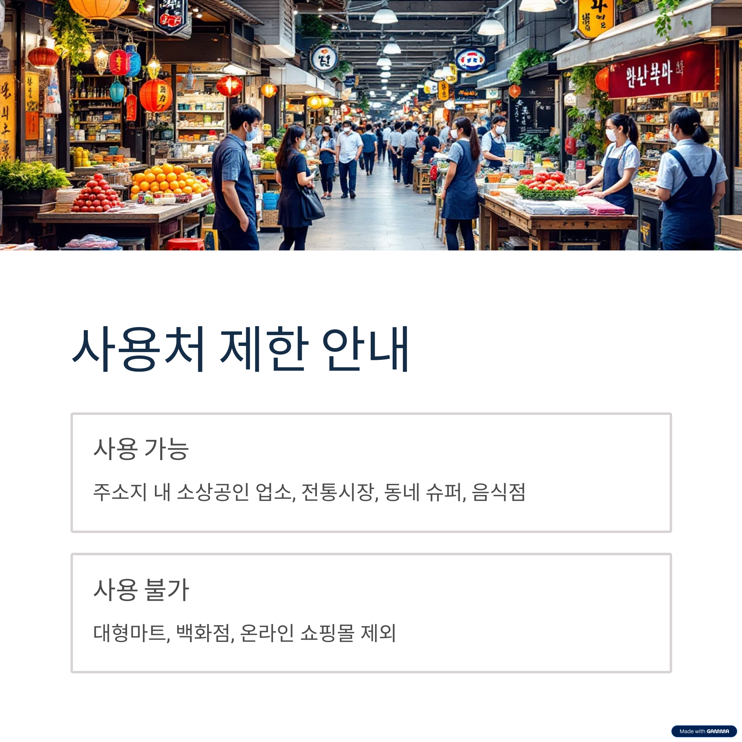 - 지역사랑상품권은 각 지자체 지정 가맹점에서만 사용 가능